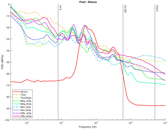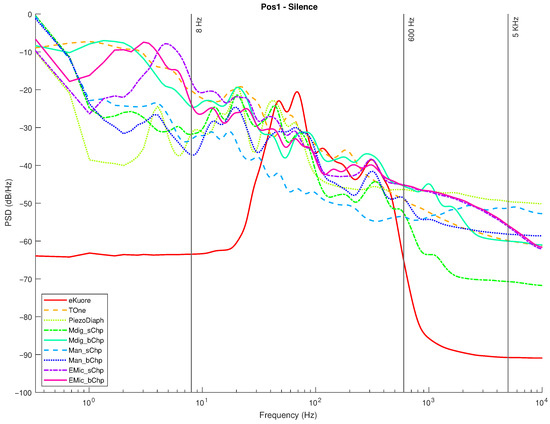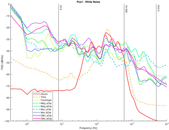 In summary, we have performed four audio recordings for each transducer by considering two different acquisition positions and two types of acquired sounds: white noise and complete silence. We selected two different acquisition locations to check for distinct sound propagation in the phantom setup. The two kinds of sounds were used: (i) a random signal with equal intensity at different frequencies reproducing the setup’s speaker of a white noise track and (ii) complete silence to compare the microphone sensitivities: The sounds recorded by the microphones and the designed acquisition system were postprocessed to extract multiple features: the PSD, PSD with octave filter, and the average power in the 8-5000 Hz band, from which the SNR can be calculated. Specifically, from the filtered PSD, the devices’ bandwidth can be estimated, while the SNR parameter illustrates noise immunity. From the achieved results, the best-performing technology is considered to be the digital MEMS-based technology, both for the large bandwidth (see Figure 22 and Figure 23 and Table 2) and the high SNR level (up to dB; see Table 3).