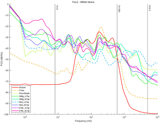 Position 2: normalized PSD microphone acquisitions with white noise.