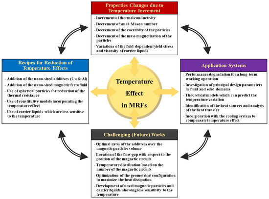 Table 4 presents a summary of the temperature effect on the working performances of various MRF application systems. It is clearly seen that MRFs are applied to special systems such as a high-power transmission system to investigate the heat generation and temperature distribution. Many studies have focused on the several methods used to reduce the thermal effect during the working operation. One of potential methodologies to minimize the thermal effect of MRF application systems is to optimize the location of the magnetic circuits while considering both the temperature distribution and the distribution of heat generation. In addition, it is known that there are several trade-off behaviors between the temperature effect and application performance. For example, the addition of nanoparticles and proper additives can mitigate the temperature effect, but the field-dependent damper force of the MR damper is decreased.