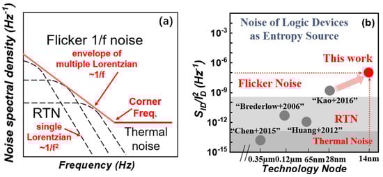At present, there are two main ways to implement SNG: one is the linear feedback shift registers (LFSR)-based pseudo stochastic number generator (PSNG) [,,,], as shown in Figure 1a. It can generate a pseudo-random sequence with a period of 2n − 1 by using an LFSR circuit composed of n flip-flops. The hardware implementation of this method is very convenient. However, it generates periodic pseudo-random numbers, which will have a bad impact on the calculation accuracy of SC. In 2020, for example, professor Salehi [] proposed an area-efficient SNG by sharing the permuted output of one linear feedback shift register among several SNGS. Although this method reduces the circuit area, it requires increased hardware complexity to reduce the correlation between the generated bit streams. The other one is to use internal noise of electronic devices (such as MOS devices or emerging memory devices) to realize SNG as shown in Figure 1b. In 2021, for example, our team [] proposed a 128 kb RRAM flicker-noise-based stochastic computing chip. The basic idea is to use flicker noise in RRAM as the entropy source for SNG, and finally this RRAM-flicker-noise-based SC chip is successfully implemented for image edge detection. Compared with emerging memory devices, MOS devices do not need additional processes, which is more convenient and economical. Generally, there are mainly three kinds of noise including thermal noise, RTN and flicker noise. All of these three kinds of noise have been exploited as entropy source due to its natural randomness, as shown in Figure 2a,b. Compared with thermal noise [], RTN [,], flicker noise [] has the advantage of high noise density, which is beneficial for the SC application. Thus, it is important to study SNG based on the flicker noise of MOS devices for the industrialization of the SC system.
