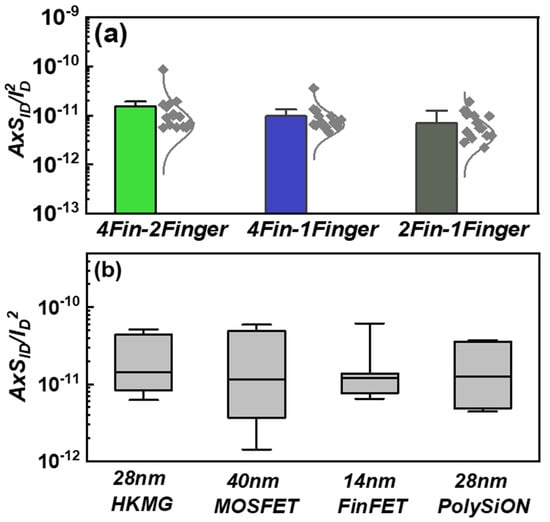 In the characteristics of 1/f noise in 2D logic devices, researchers generally believe that the normalized drain current noise (A × SID/ID2) is approximately a constant when VGS equals to Vth, and the amplitude of normalized drain current noise (SID/ID2) is inversely proportional to the area of the device channel []. Here, A is the area of the device channel, SID is the current noise of the drain end, and ID is the current of the drain end. In order to systematically explore the 1/f noise characteristics of 3D logic devices, we have made a statistical study of three different FinFET devices, namely 4Fin-2Finger, 4Fin-1Finger and 2Fin-1Finger. As shown in Figure 3a, the normalized drain current noise (A × SID/ID2) is also approximately a constant in three FinFET devices with different structures. Compared with the other three 2D logic devices, namely HKMG with a 28 nm process, PolySiON with a 28 nm process and HLMC with a 40 nm process, it is found that the normalized drain current noise (A × SID/ID2) parameters of devices with different process nodes, different materials and different structures are all approximately a constant, as shown in Figure 3b. This shows that the amplitude of the normalized drain current noise (SID/ID2) has nothing to do with the process node, material and structure, but only with the area of the channel, whether in 2D or 3D logic devices. Therefore, reducing the channel area is one of the effective ways to obtain high-density noise. In addition, we can see from Figure 3b that the variance of the normalized drain current noise (A × SID/ID2) of devices with different process nodes is different, and as the process node decreases, the variance of the normalized drain current noise (A × SID/ID2) also becomes smaller. A possible reason is that as process nodes are scaled down, the variability in defect density distribution in the device channels also decreases.