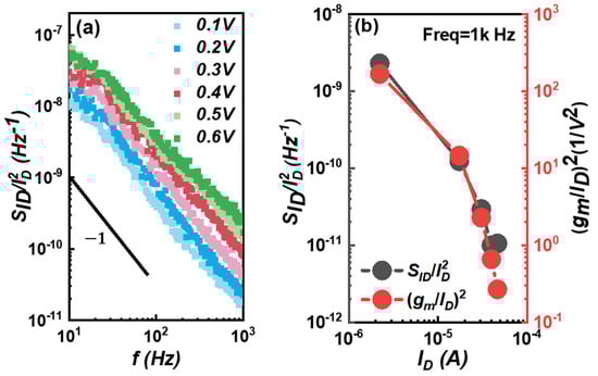 From Formula (2), we know that when carrier number fluctuation (CNF) plays a major role, the trends of normalized drain current noise (/) and (gm/ID)2 are the same. On the other hand, according to Formula (4), normalized drain current noise (SID/ID2) is inversely proportional to the drain current. As shown in Figure 4a, we measured the noise density curves under different VGS biases. Meanwhile, the relationship between noise density and the ID of the device at 1000 Hz is drawn in Figure 4b. The trend of noise density and ID is the same as that of its (gm/ID)2 and ID.