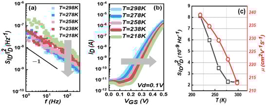 At the same time, we also measured the ID-VGS curve of the device in the temperature range of 218–298 K and calculated the relationship between carrier mobility and temperature as shown in Figure 5b,c. It can see that the mobility decreases with the increase in temperature in the linear region (VDS = 0.1 V), which is consistent with the trend of noise density and temperature. This result further verifies that the 3D FinFET devices conforms to McWhoter’s model. Thus, reducing the ambient temperature provides a new way to obtain larger noise without reducing the channel area of the device.