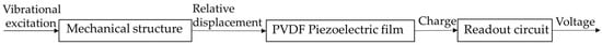 The fixed end is fastened to the vibration exciter plane through a pedestal. When the exciter plane vibrates, the fixed end drives the free end to produce a relative displacement, thereby causing stress of the PVDF piezoelectric film and generation of charges on its surface. The charge is ultimately converted to voltage through the read-out circuit. In accordance with Figure 2, the designed sensor process consists of three parts: the mechanical part, which is a second-order inertial system that determines the relationship between the relative displacements of the fixed end and the free end based on different vibration frequencies; the charge generation part, which involves straining the piezoelectric material due to the relative displacement to generate charge; and the readout circuit part, which converts the charge into a voltage.
