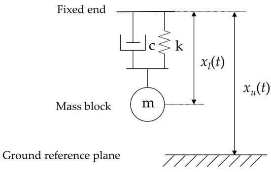 As shown in Figure 3, the cantilever beam structure is essentially a second-order inertial system composed of a mass block, a spring, and a damper [29]. When the vibration exciter plane generates vibrational excitation xu(t), the free end of the cantilever beam undergoes relative displacement xl(t) with respect to the fixed end due to inertia, where k represents the stiffness coefficient of the cantilever beam structure, c represents the damping coefficient, and m represents the mass of the mass block. According to Newton’s second law and after performing a Laplace transform, the transfer function between the relative displacement Xl(s) and the fixed end displacement Xu(s) can be obtained as follows: