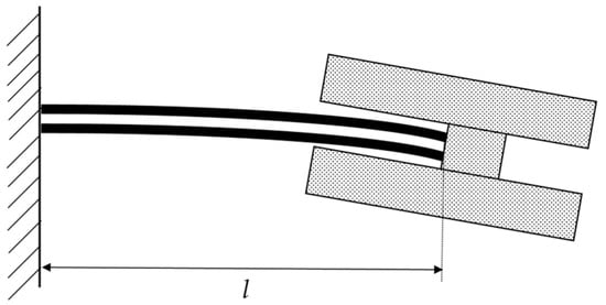 The location of the mass block of the single-arm piezoelectric cantilever is adjusted to place the center of mass at the cantilever’s end by inserting a shim at the end xl = xl(L), shown in Figure 5. As a result, the single-arm cantilever structure’s stiffness coefficient k1 can be expressed as follows: