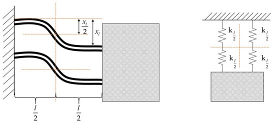 Figure 6. First-mode vibration shape and equivalent spring connection diagram of a double-arm piezoelectric film cantilever beam.