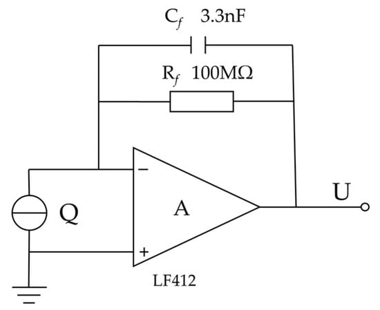 A charge amplifier is created to transform the charge signal into a voltage signal for further processing due to the modest output charge of the piezoelectric thin film cantilever beam, which is generally in the range of tens or hundreds of pC [33]. The schematic diagram of the desired charge amplifier circuit is shown in Figure 7.