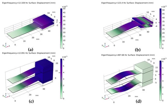 Figure 8. Modal vibration mode contour plots of PVDF piezoelectric film cantilever beams: (a) first-mode shape of the single-arm structure; (b) second-mode shape of the single-arm structure; (c) first-mode shape of the dual-arm structure; (d) second-mode shape of the dual-arm structure.