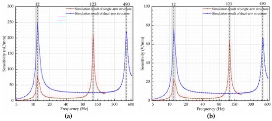 In the conducted experimental tests, the dual-arm structure exhibited a significantly lower sensitivity before the second-order frequency compared to the predicted sensitivity. This could be attributed to the superposition of the two vibration modes, causing charge cancellation and resulting in reduced sensitivity.