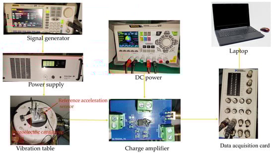 The main components included in the test system are a Rigol DP831A DC power supply, a Rigol DG5252 signal generator, a Bruel & Kjaer LDS LPA600 power amplifier, a Bruel & Kjaer LDS VIBRATOR V450 vibration table, a Bruel & Kjaer 4370 V reference accelerometer, and an NI USB-6216 data acquisition card. Figure 13 shows the test procedure flowchart, in which the signal generator is used to output a sinusoidal excitation signal. The power amplifier amplifies and transmits the power to the vibration table, and the vibration table generates vertical vibration at a given frequency. The PVDF piezoelectric film cantilever beam vibration sensor and the reference accelerometer are placed on the same vibration plane. The charge signal generated by the PVDF piezoelectric film cantilever beam vibration sensor is converted to a voltage signal through a charge amplifier, which is then collected by the data acquisition card and sent to the notebook computer for processing to obtain the output voltages of the two sensors. In this test experiment, the sinusoidal sweeping excitation frequency of the vibration table was in the range of 5 Hz to 598 Hz, and the measurement frequency intervals are shown in Figure 14.