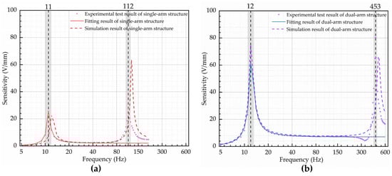 Experiments on both structures were performed to calibrate the sensitivity, damping coefficient, and natural frequency, which are the parameters of a second-order inertial system transfer function. In this experimental test, for the single-arm structure, the test range was 5 Hz to 202 Hz and the fitted range was 5 Hz to 68 Hz; for the dual-arm structure, the test range was 5 Hz to 598 Hz and the fitted range was 5 Hz to 270 Hz. The test results and fitted curves are shown in Figure 14.
