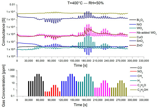 A typical dynamic response of the sensors at 400 °C is reported in Figure 2, reporting the electrical conductance of each sensor overtime during the injections of the different chemical compounds. At this temperature, most of the sensors exhibit a strong variation of the conductance in the presence of hydrogen, which is the main target compound of the present study. However, these sensors also respond to other compounds, mainly nitrogen dioxide, acetone, and ethanol. Interestingly, CuO and α-Bi2O3 devices, despite a low overall response, do not have any appreciable response to hydrogen but only to the identified interfering gases. This is an important feature to enhance the selectivity of the array, as described afterward.