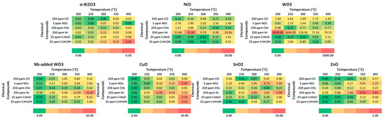 Figure 3 reports the heatmaps of sensors’ response at different concentrations of chemical compounds in the 200–400 °C temperature range. Sensor responses have been calculated as ΔG/G, and reported numbers are the mean values of multiple measurements. Each sensing material has its own response spectrum, which is influenced by the operating temperature. Humidity in the environment often is considered an interfering compound and should be treated as other chemicals. However, at this stage, the relative humidity during all measurements was kept constant at 50%.