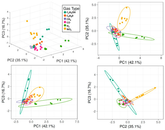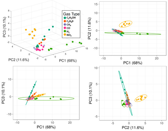 PCA applied to data from all sensors working in 250–400 °C temperature range. Axes report the principal components 1, 2, and 3 that explain 68%, 11.6%, and 10.1% of the total variance, respectively. Prediction ellipses are such that with a probability of 0.95, a new observation from the same group will fall inside the ellipse.