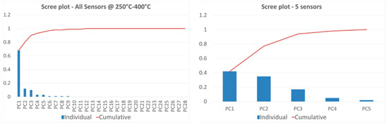 Scree plots of the individual (in blue) and cumulative (in red) variance carried in principal components calculated using all sensors at 250–400 °C (Left) and using the reduced array (Right).