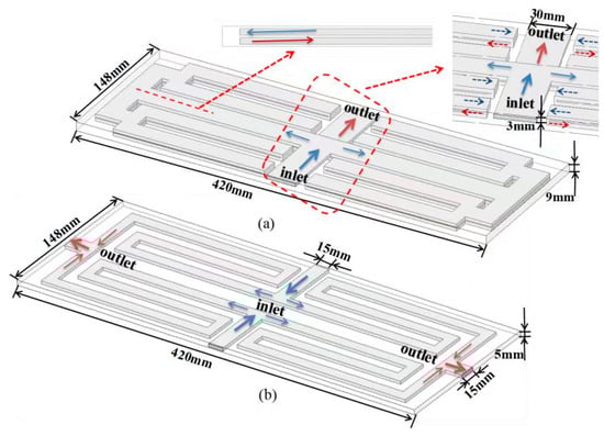 The LBM comprises 15 cells that are connected to a liquid cooling plate through a thermal pad. These cells are assumed to have anisotropic thermal conductivity, with lower conductivity in the thickness direction. Under different discharge conditions, the heating power of the cell is different; thus, two different LCP structures are proposed. Figure 1 illustrates the layout of bottom cold plates with a double-layer (DLCP) and single-layer (SLCP), respectively. The minichannel structures in DLCP with one inlet and one outlet are shown in Figure 1a, and those of SLCP with two inlets and two outlets are shown in Figure 1b. The inlets and outlets for SLCP and DLCP are arranged at the center of the LBM. To enhance heat dissipation, fluid is introduced near the symmetry line. Since LCPs are not allowed at the top of the LBM due to the replacement operation, the top of the battery is prone to heat accumulation, and the heat at the top can be reduced by arranging side LCPs (see Figure 2a). The thickness of the aluminum alloy material is 1 mm, and the height of the minichannel is 3 mm and 1.5 mm for the bottom LCP and side ones. The length, width, and height of the bottom SLCP and DLCP are 420 mm × 148 mm × 5 mm and 420 mm × 148 mm × 9 mm, respectively. Additionally, the size of the side LCP is 420 mm × 46.5 mm × 3.5 mm. Moreover, the inlet channel widths are 30 mm, 15 mm, and 15 mm for the bottom SLCP, DLCP, and side LCP, respectively.