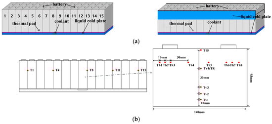 To investigate the cooling performance of LCP in the LBM, various monitoring points are set up to observe temperature changes over time at different locations. These monitoring points are strategically positioned in a non-equidistant manner, considering the improved heat dissipation near the cold plate, to better explore the temperature variations across the cell. Figure 2b illustrates that T1, T4, T8, T11, and T15 are placed at the same position in the LBM for different cells to monitor the temperature between the two cells. Additionally, vertical monitoring points, Tv1–Tv5, are arranged at different locations on the middle cell’s side.