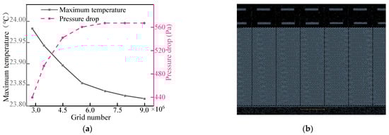 In order to ensure the accuracy of simulation results, grid independence verification was carried out using the structure in Figure 3a. First, surface meshes of different cell sizes were generated, and then volume meshes were generated for numerical analysis under the same boundary conditions. The effect of the number of cell grids on the maximum temperature of the battery pack and the pressure drop of the liquid cooling system was tested. As can be seen in Figure 3, the maximum temperature decreased, and the relative error gradually decreased as the number of bulk grids increased. For the liquid-cooled system, the pressure drop tended to be constant as the number of meshes was encrypted. When the number of grids exceeded 6 million, the error in the maximum temperature and pressure drop of the LBM became small enough, so grid models with good convergence properties were selected for subsequent studies.