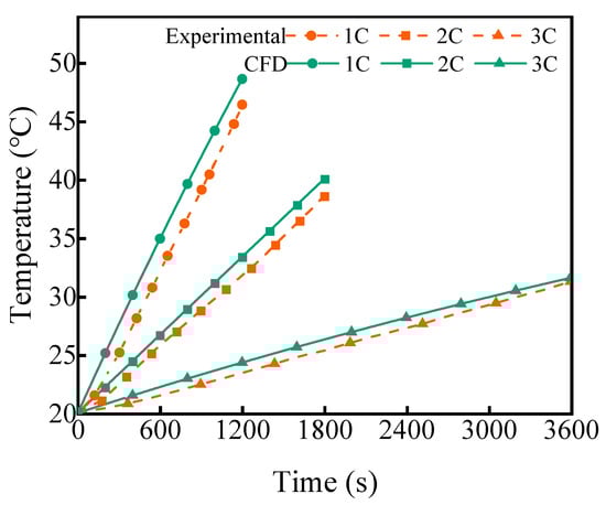 In order to validate the cell model, the simulation results were compared with the experimental data. Under 1C, 2C, and 3C discharge conditions, the heat powers of the battery were 3.24 W, 11.48 W, and 22.18 W, respectively. Discharge tests were conducted at 20 °C under different rates. The simulation tool STAR-CCM+ was used to obtain the changes in temperature, and the experimental temperature over time is depicted in Figure 4. It is clear that the simulation results closely match the experimentally measured temperatures, with a maximum error of approximately 2 °C.