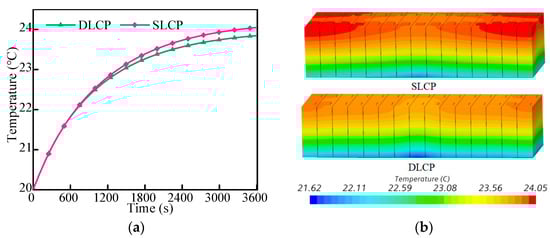 SLCP and DLCP were arranged at the bottom of the LBM, and the battery pack was discharged at 1C under the environment of 20 °C. The initial temperature of coolant in the liquid cooling system was 20 °C, and the mass flow rate was 20 g/s. In Figure 5a,b, within 3600 s of discharge, the temperature of the battery pack increased with time and reached its highest value at the end of the discharge process. When the structure of the LCP was a serpentine channel structure, the maximum temperature of the battery pack was 24.05 °C; the maximum temperature of the double-layer channel structure was 23.85 °C. It was found that the DCLP slightly reduced the maximum temperature of the battery pack and improved the cooling performance of the liquid cooling system.