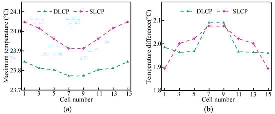 Figure 6 illustrates the maximum temperature and temperature difference for different cells in the LBM. The results demonstrate that the two different structures of the LCP can control the maximum temperature and temperature difference in the battery pack within a reasonable range. Additionally, the maximum temperature and the temperature difference between different cells in SLCP and DLCP exhibit a consistent trend. Specifically, the temperature was lower near the coolant inlet and gradually increased further away from the inlet. Furthermore, the maximum temperature of cells in DLCP was approximately 0.2 °C lower than that in SLCP, while the temperature difference between cells ranged from 0.1 °C to 0.2 °C. Therefore, the DLCP slightly reduced the temperature difference between the cells in LBM compared to SLCP.