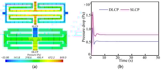 The internal structure of the LCP has an impact on the flow of the coolant and subsequently affects the pressure drop in the liquid cooling system. Figure 7a illustrates the pressure distribution in two different flow channels. The pressure is highest at the channel entrance and lowest at the exit. It gradually decreases from the entrance to the exit, but the pressure drop is more evenly distributed in the DLCP.