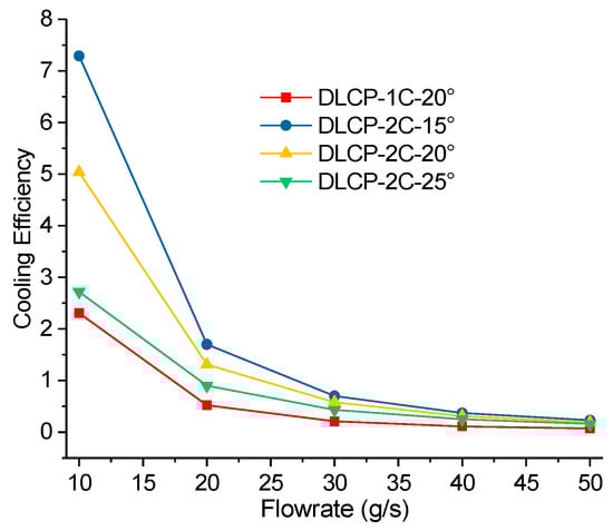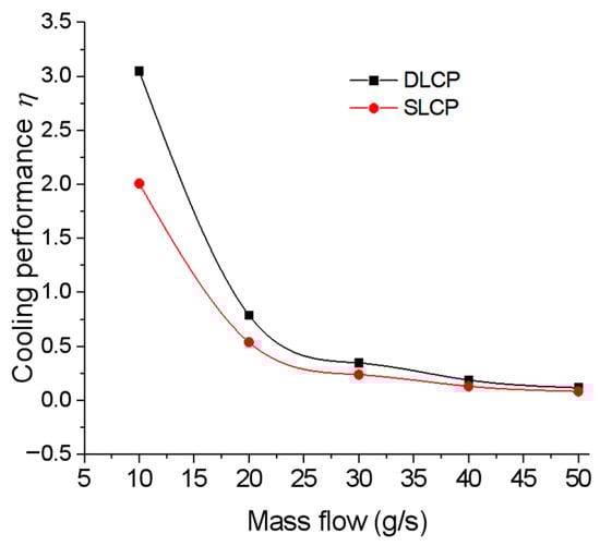 Figure 7b illustrates the variation in pressure drop in the cooling system over time. The pressure drop curve exhibits an abrupt increase and decrease during the initial phase. This occurs when the LCP does not pass into the coolant, causing the pressure in each channel of the liquid cooling plate to be equal to the outlet pressure. As the coolant enters the initial phase of the cold plate, it does not immediately flow through all the channels, leading to a sharp rise in inlet pressure while the outlet pressure remains constant. Consequently, there is a rapid increase in pressure drops. As the coolant continues to flow in and the coolant channel extends, the contact area between the coolant and the channel increases, which leads to a decrease in flow resistance. Finally, the coolant flows through all channels, and the pressure drop of the cooling system is equalized. A remarkable observation is that the pressure distribution within each divergent channel of the DLCP structure appears to be uniform. In addition, the pressure drop in the two LCPs was measured to be 770 Pa and 519 Pa, which represents a reduction of 48% compared to the pressure drop in the SLCP structure. The main reason is that the inlet size for DLCP with one inlet is double that for SLCP with two inlets for obtaining the identical inlet velocity at a fixed total flow rate. A comparison of the comprehensive cooling performance defined by Equation (11) for DLCP and SLCP was conducted and indicates that cases with flowrates less than 20 g/s may have better cooling performance (Figure 8). Furthermore, all the findings suggest that DLCP exhibits improved cooling performance while consuming less power.