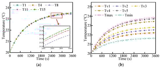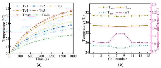 Figure 9 shows the temperature difference between the cells of the LBM and the temperature of the test site at different locations. During discharge at a rate of 1C, cell T8 is close to the coolant inlet and, therefore, has a slightly lower temperature, while cells T1 and T15 have slightly higher temperatures due to the distance between them. Throughout the LBM, the temperature difference between different cells at the same location during the discharge process is very small, indicating that the DLCP has good cooling performance and ensures uniform temperature between cells. In the vertical direction of the cell, the temperature is lowest for Tv1 and highest for Tv5. The temperature gradually increases from bottom to top, mainly because the closer the position is to the cold plate, the better the heat dissipation of the cell and the lower the temperature. It can be concluded that the temperature uniformity of the battery pack is better when the discharge rate is 1C, meeting the requirements of normal working conditions.