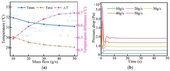 Effects of different flow rates on thermal management performance (a) and evolution of pressure drop with mass flow rate (b).