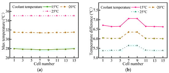 As shown in Figure 12, it can be found that the maximum temperature of the cell is relatively uniform for the three different coolant temperatures, but the temperature difference between cells near the coolant inlet is large. When the inlet temperature of the coolant was 15 °C, after 30 min of discharge, the maximum temperature of the battery module was 27.96 °C. The maximum temperature difference between cells was 7.06 °C. When the initial coolant was 20 °C, the maximum temperature of the battery module increased by 3.65 °C. The maximum temperature difference between monomers was 6.35 °C. When the coolant was 25 °C, the maximum temperature of the battery module was 35.07 °C, and the temperature difference between cells was reduced by 0.69 °C. Obviously, the lower the inlet temperature of the coolant, the better the cooling performance of the liquid cooling system and the lower the maximum temperature control. However, the lower the temperature at the inlet, the lower the temperature at the bottom of the LBM for a longer period of time, and the high temperature at the top cannot be transferred to the bottom in a timely manner, resulting in a larger temperature difference between cells. When the inlet temperature of the coolant was 20 °C, which is close to the initial temperature of the battery module, the maximum temperature of the battery pack and the temperature difference between cells were well controlled.