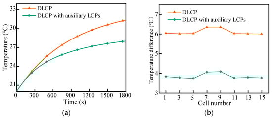 To address the large temperature difference in the LBM during high-rate discharges, we arranged the auxiliary LCPs on the side of the module to form a double-layer minichannel at the bottom and an auxiliary flow channel on the side. According to Figure 2, the addition of auxiliary LCPs to the liquid cooling system resulted in a mass flow rate of 10 g/s for the bottom channel and 5 g/s for the side channel, while the mass flow path remained at 20 g/s. Figure 14 shows that at a discharge rate of 2C, the maximum temperature of LBM in the DLCP with auxiliary LCPs was 27.86 °C after 30 min of discharge, which was 3.75 °C lower than DLCP. Additionally, the maximum temperature difference in monomer in the module was 4.09 °C, which is 2.26 °C lower than that of DLCP. These results indicate that the addition of auxiliary LCPs improves the cooling performance of the liquid cooling system and reduces the maximum temperature of LBM. It also ensures the uniformity of battery temperature under high-rate discharge conditions.