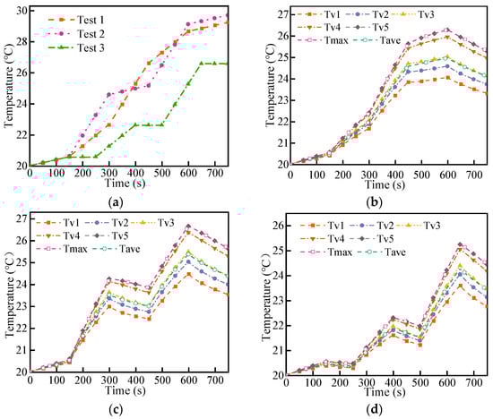 Temperature of battery versus time: (a) temperature without coolant, (b) temperature of test 1, (c) temperature of test 2, and (d) temperature of test 3.