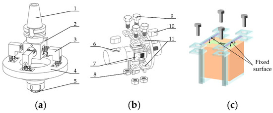 Figure 3 shows the milling force measurement tool system in two-end square hoop compression sensor mode. The structure of the tool system is similar to that shown in Figure 2, except that the sensor is fixed in a different way. As shown in Figure 3c, the sensor is fixed with square hoops at two ends.