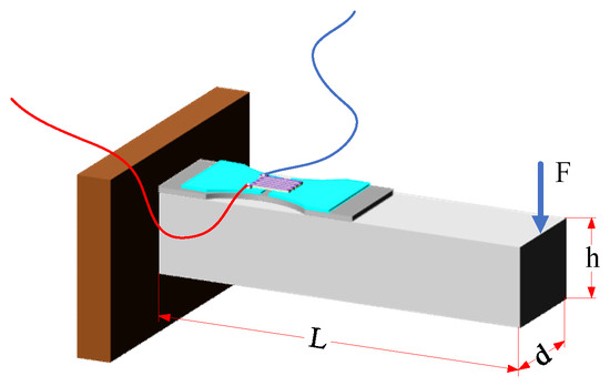 As shown in Figure 5, the elastic beam is identical in shape to the cantilever beam. When a force is applied to the free end of the cantilever beam, a change results in the strain value on the sensor. The stress–strain relationship of the cantilever beam can be defined as