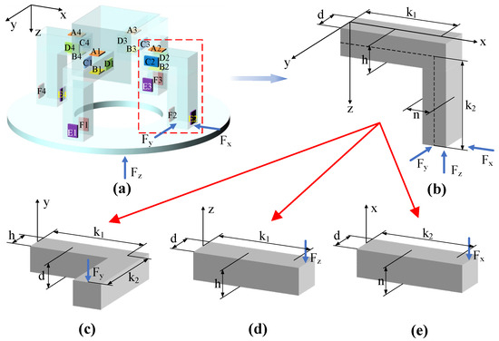 The link block, four elastic beams and tool holder (Figure 1) constitute the elastomer model that is subjected to three-directional cutting force, as shown in Figure 6. As the installation positions of the elastic beam and the sensor are symmetrical, a simplified model can be established by selecting one of the four elements of the elastic beam.
