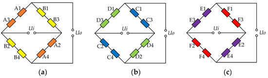 Wheatstone bridge connection diagram. (a) Wheatstone bridge for axial force Fz; (b) Wheatstone bridge for circumferential force Fy; (c) Wheatstone bridge for radial force Fx.