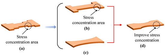 A stepped-type substrate with good strain sensitivity has been designed, as shown in Figure 8a. But this structure has many right-angles, and stress concentrations occur at right-angles. The strain sensitivity values of the H-type substrate (Figure 8b) and the arc-type substrate (Figure 8c) are second only to that of the stepped-type substrate. The surface strain distribution of these two substrates was increased, but the degree of reduction in their stiffness was small. Therefore, combining these two substrates, an H-type substrate with a transitional arc has been designed, as shown in Figure 8d.