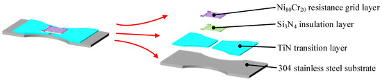 The thin-film system shown in Figure 9 is composed of a transition layer, an insulating layer and a resistance grid layer. Because the Si3N4 thin-film has a high dielectric constant and good density, it is suitable for use as an insulating material in microelectronics applications, so the material of the insulating layer is Si3N4. Previous studies have shown that the capacity for binding between the insulating layer and the substrate was not good, so a transition layer was added between the substrate and the insulating layer to ensure the insulating layer could grow well on the substrate’s surface. The film–substrate binding capacity, using a TiN thin-film and 304 stainless steel substrate, is better; the film-binding capacity is also good when using a TiN thin-film and a Si3N4 thin-film. Therefore, TiN was selected as the material of the transition layer thin-film. The material and structure of the resistance grid layer seriously affect the performance of the sensor. When using nichrome (Ni80Cr20) as the resistance grid layer, it can work normally at high temperatures below 450 °C.