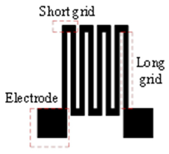 The long grid’s size is 2.1 mm × 0.05 mm, the short grid’s size is 0.2 mm × 0.1 mm, the thickness of the resistance grid layer is 1 μm, and the resistance grid comprises 10 long grids and nine short grids. The width of the strain gap is about 0.1 mm. The depth of the strain gap is about 500 nm.