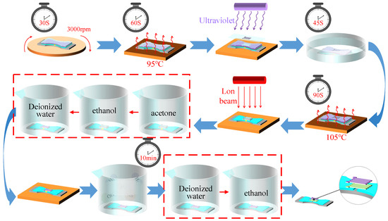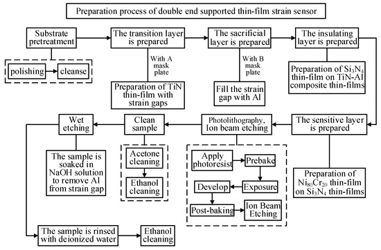 Figure 12 shows the preparation process of the double-end-supported thin-film strain sensor. The preparation process includes cleaning, magnetron sputtering deposition, photolithography, ion beam etching and wet etching. The pretreatment of the substrate, the removal of the photoresistor after ion beam etching and the removal of residual etching liquid after wet etching are all cleaning processes. The preparation of the transition layer, the sacrificial layer, the insulating layer and the sensitive layer comprise the magnetron sputtering coating process. Finally, the double-end-supported thin-film strain sensor is completed by cleaning it.