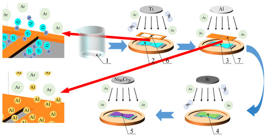 Magnetron sputtering deposition process. 1, substrate; 2, TiN thin-film; 3, Al sacrificial layer; 4, Si3N4 thin-film; 5, Ni80Cr20 thin-film; 6, A-mask plate; 7, B-mask plate.