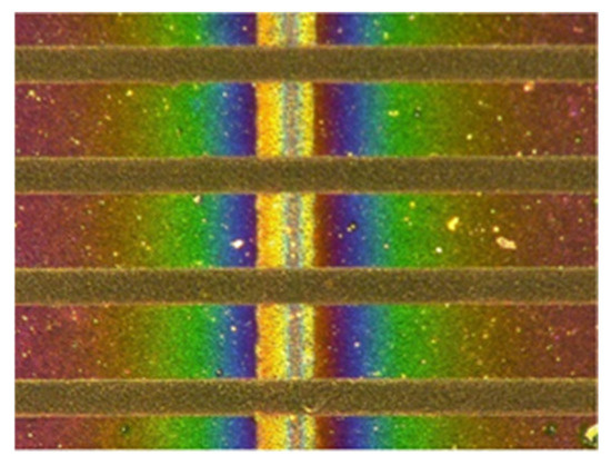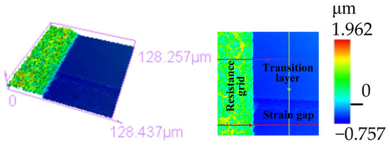 As shown in Figure 16, the resistance grid was observed using extended depth-of-field microscopy. The boundary of the resistance grid and the etching pattern were determined with high accuracy. The resistance grid, transition layer and strain gap on the double-end-supported thin-film strain sensor’s surface could be clearly seen. As shown in Figure 17, a 128.437 μm × 128.257 μm cavity region consisting of a resistance grid, a transition layer and a strain gap was observed using the Confocal Microscope. The maximum height of the thin-film system was 1.962 μm, indicating that the distance from the bottom of the strain gap to the surface of the resistance grid was about 2 μm, which is basically consistent with the thickness of the designed thin-film system.