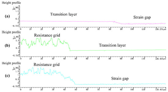 In Figure 18, the scanned regions between the transition layer and the strain gap (Figure 18a), the resistance grid and the transition layer (Figure 18b), and the resistance grid and the strain gap (Figure 18c) were all determined, and three sets of height waveform diagrams were obtained.