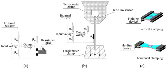 Electrical performance test. (a) Wheatstone bridge connection diagram; (b) test platform schematic diagram; (c) clamping mode.