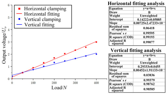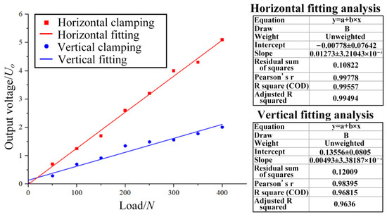 The fitting analysis in Figure 21 shows that the fitting value R2 is close to 1, indicating that the linear error of the fitting result is small, and the double-end-supported thin-film strain sensor has good linearity. Under the same load, the voltage generated using horizontal clamping is larger than that generated using vertical clamping, meaning horizontal clamping produces greater strain.