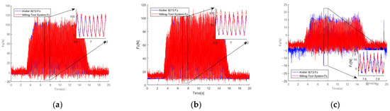 Plots of three-directional cutting force signals over time yielded by the milling force measurement tool system and the Kistler dynamometer. (a) Radial force Fx; (b) circumferential force Fy; (c) axial force Fz.