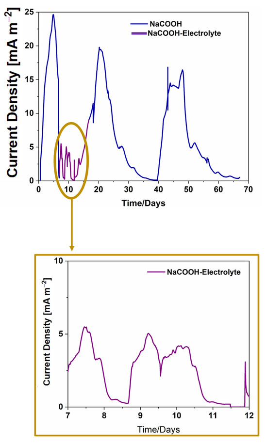 Current density production over time: the blue line refers to current density produced by a-SCMFCs running with sodium acetate, and the purple line shows the current density obtained during exposure to tetracycline. Results collected during exposure to antibiotics are magnified and highlighted in the yellow box.