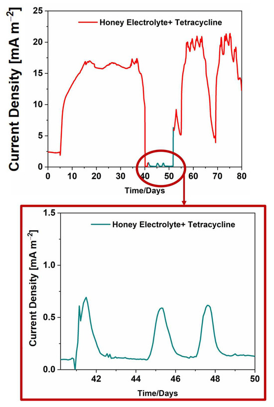 The red curve in the main graph refers to the current density for MFCs fed with honey, while in light blue, the current density produced during exposure to tetracycline is proposed. Current density during exposure to tetracycline is magnified and highlighted in the red box.