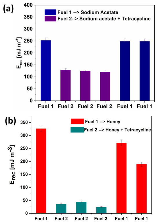 Recovered energy (Erec) calculated for SCMFCs using two different electrolytes: (a) the water-based electrolyte containing sodium acetate only and sodium acetate with tetracycline; (b) honey-based electrolyte and honey with tetracycline added. In both (a,b), Fuel 1 refers to the uncontaminated electrolyte, while Fuel 2 refers to the electrolyte with tetracycline.